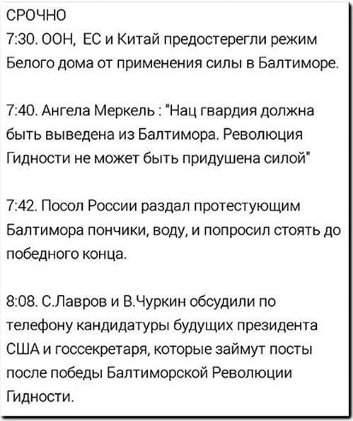 «А что наши спят? Нужно срочно выехать Лаврову и раздать демонстрантам тульские пряники и выразить большую озабоченность в отношении властей США за притеснение людей и беспредел со стороны полиции!»